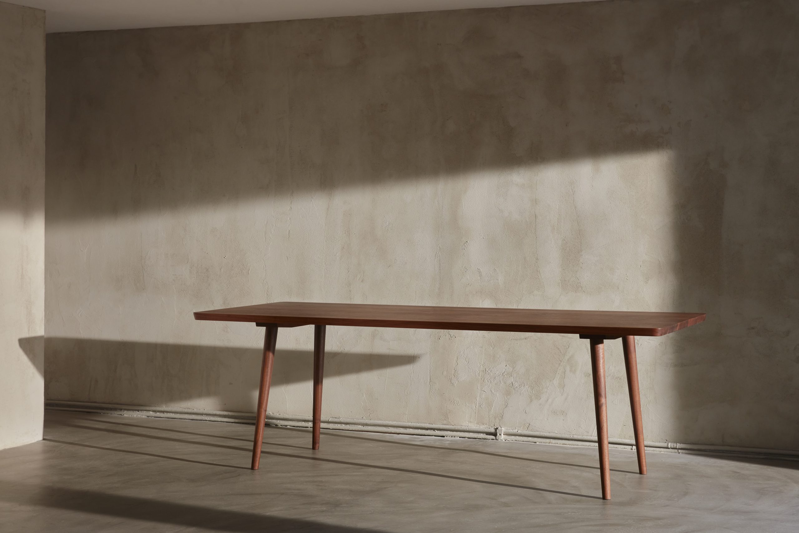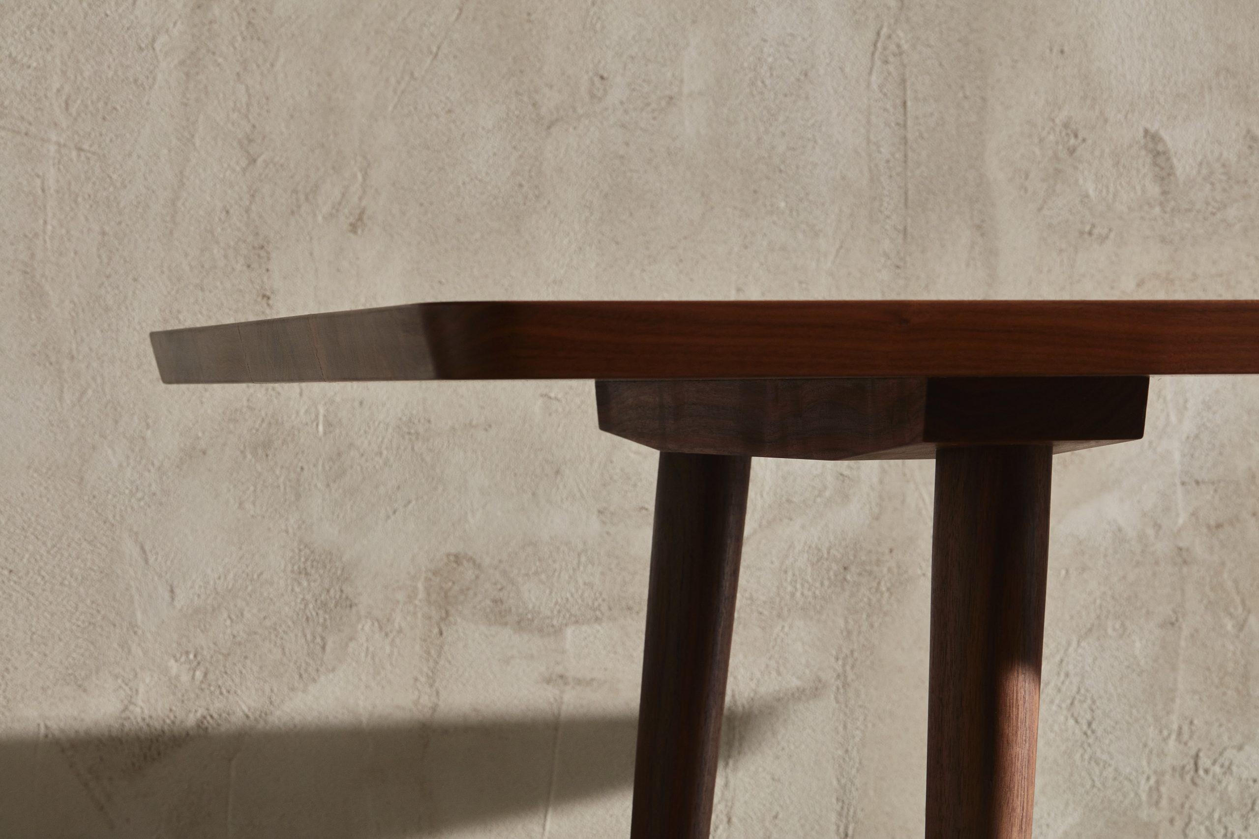 PUR drängt sich nicht in den Vordergrund, ist aber so anziehend, dass man kaum davon aufstehen will. Woran das liegt? An den sanft abgerundeten Ecken der Tischplatte. An den samtweichen Massivholzoberflächen aus amerikanischem Nussbaum, geölter Eiche oder Räuchereiche. Und natürlich an der sorgfältigen Handfertigung, die man an jedem Detail sieht und spürt.