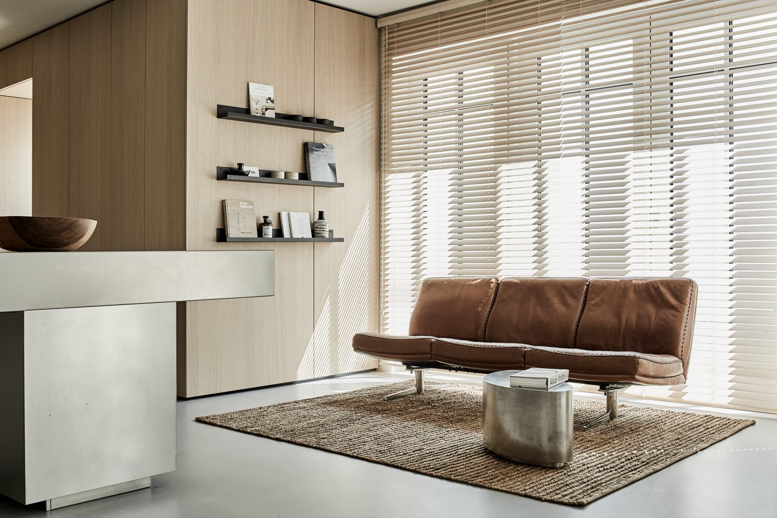 Die Insel wird auf beiden Seiten von raumhohen Küchenschränken aus gebürsteter, geölter Eiche eingefasst. Das Holz bringt Tiefe und Wärme in die offene Fläche. Davor: großflächige Fenster, geschützt von beweglichen Holzjalousien. Sie filtern das einfallende Sonnenlicht, werfen ruhige Schatten auf den Boden und lassen es über die Stahloberfläche wandern. Für eine ausgewogene Balance zwischen Material und Raum, zwischen Coolness und Wärme, zwischen Funktion und Atmosphäre.