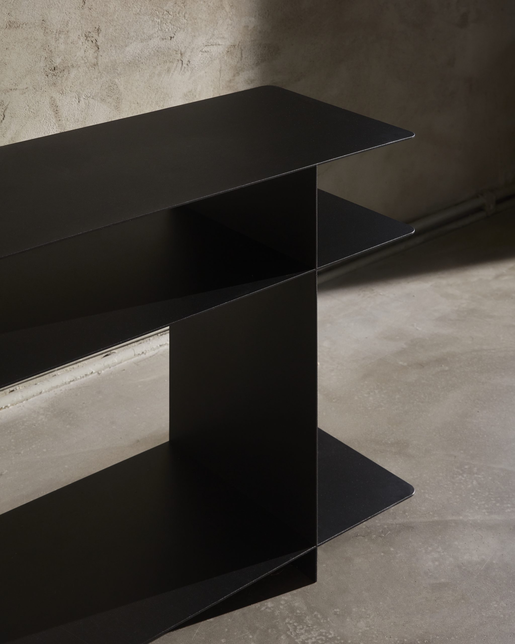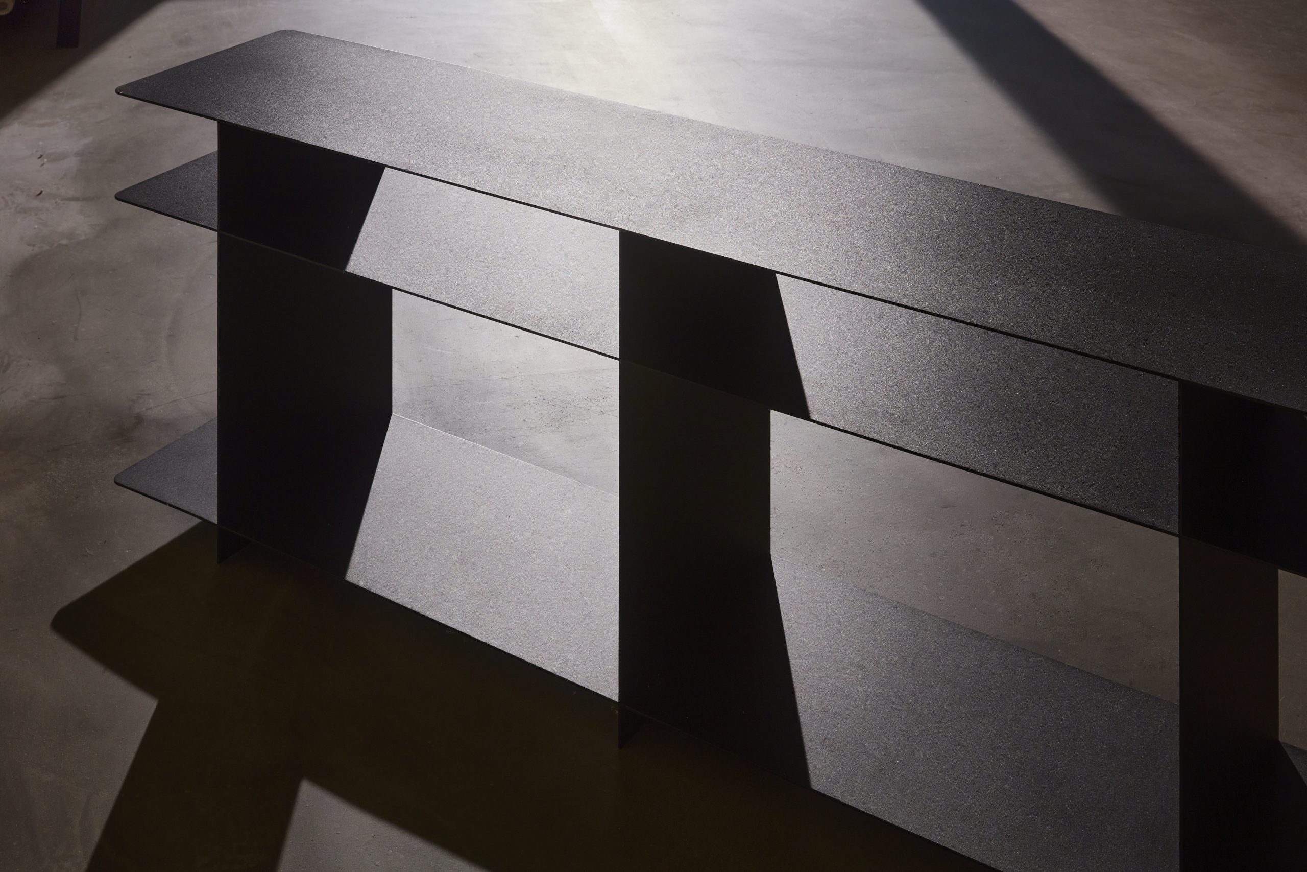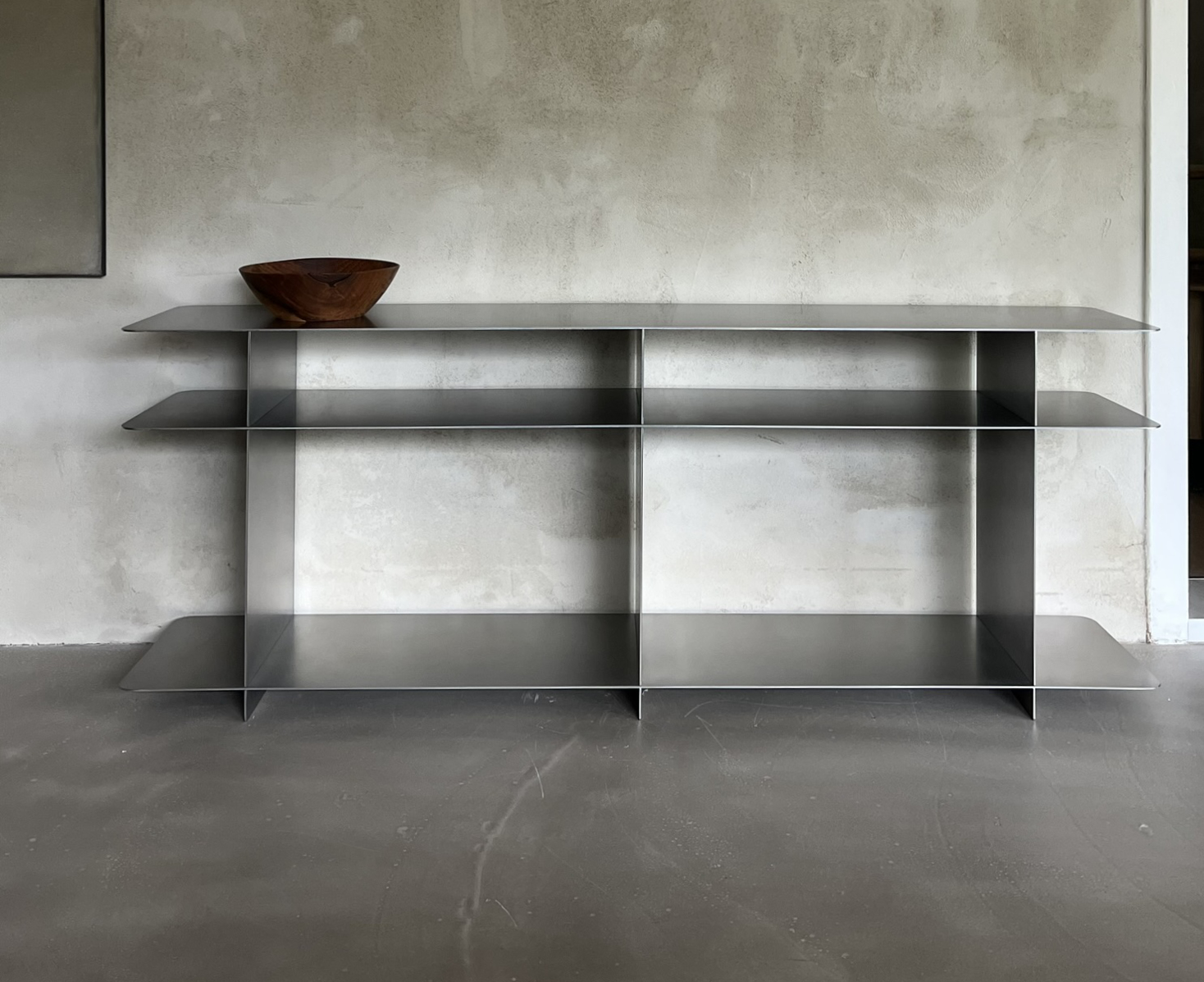 Trotz seiner filigranen Erscheinung ist Slim stabil – und trägt mehr, als man ihm ansieht. Die abgerundeten Ecken sind typisch für .PEAM und bilden einen ruhigen Gegenpol zur Klarheit des Materials: wahlweise mattschwarz pulverbeschichteter Stahl oder gebürsteter Edelstahl.